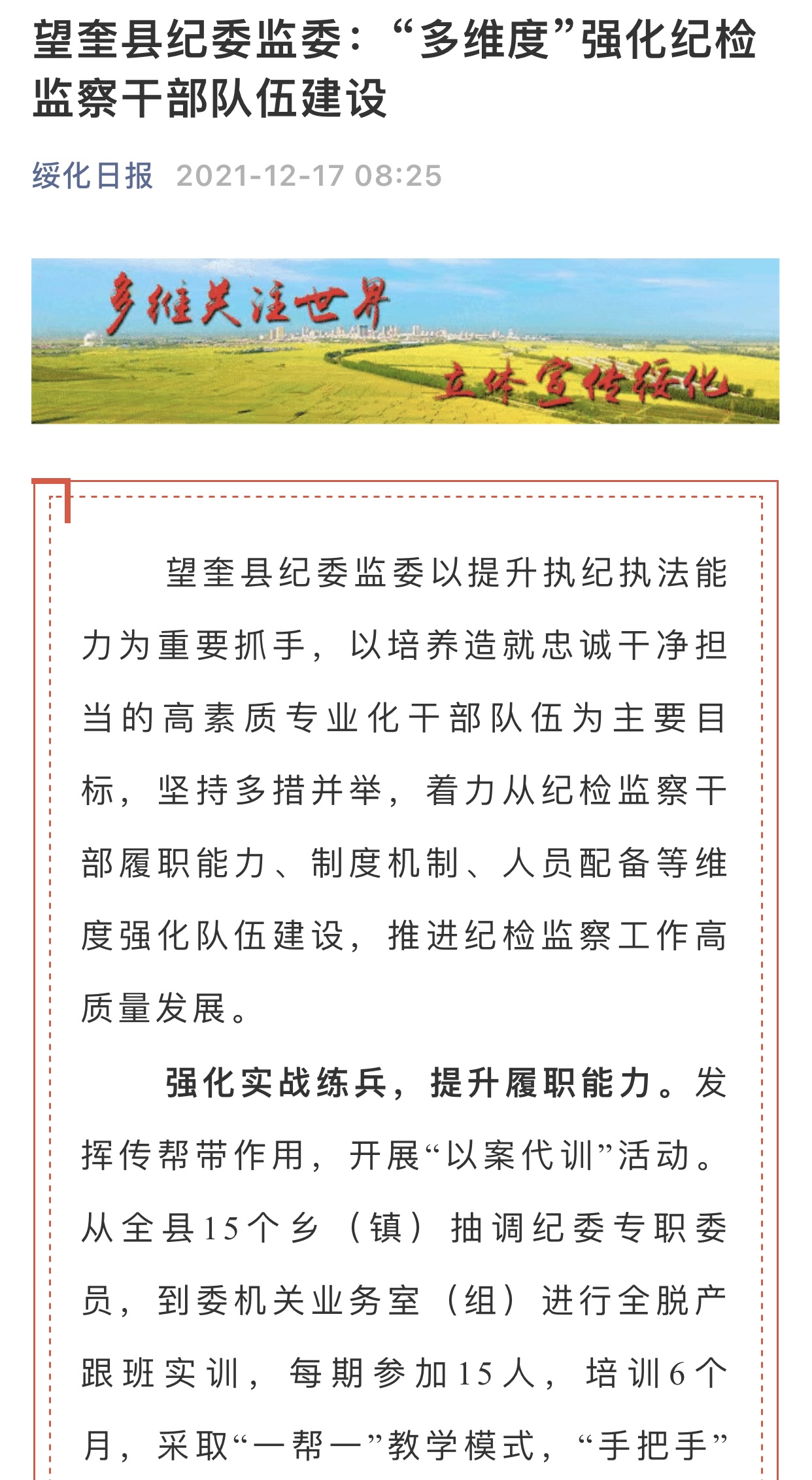 望奎县纪委监委以提升执纪执法能力为重要抓手,以培养造就忠诚干净担当的高素质专业化干部队伍为主要目标,坚持多措并举,着力从纪检监察干部履职能力、制度机制、人员配备等维度强化队伍建设,推进纪检监察工作高质量发展。