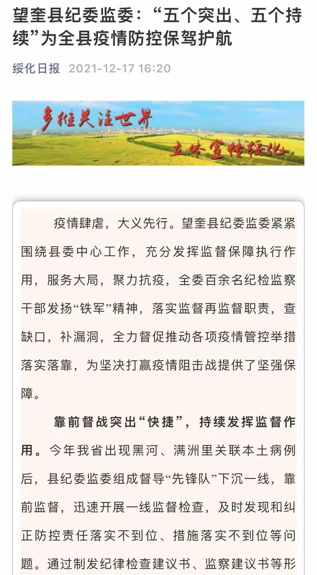 疫情肆虐,大义先行。望奎县纪委监委紧紧围绕县委中心工作,充分发挥监督保障执行作用,服务大局,聚力抗疫,全委百余名纪检监察干部发扬“铁军”精神,落实监督再监督职责,查缺口,补漏洞,全力督促推动各项疫情管控举措落实落靠,为坚决打赢疫情阻击战提供了坚强保障。