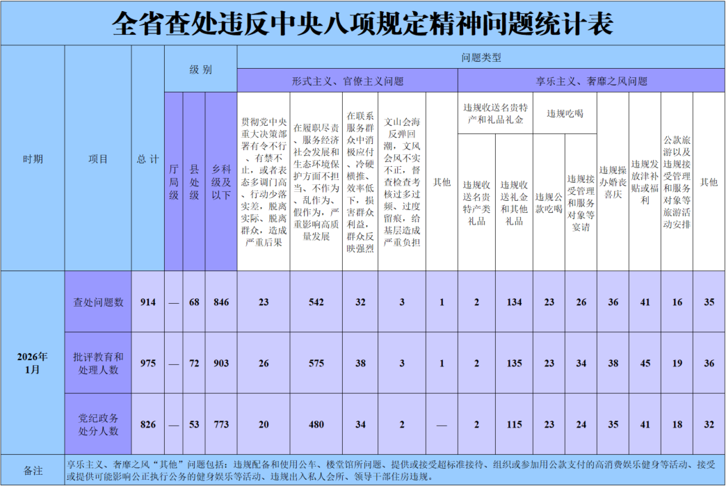 2026年1月,黑龙江省纪检监察机关共查处违反中央八项规定精神问题914起,批评教育和处理975人,其中党纪政务处分826人。